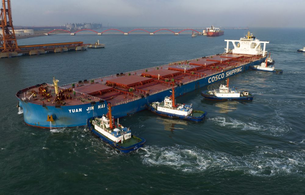 一艘輪船在拖輪的協(xié)助下向河北港口集團(tuán)唐山港曹妃甸港區(qū)礦石碼頭靠泊(2022年9月10日攝,無人機(jī)照片)。新華社記者 楊世堯 攝