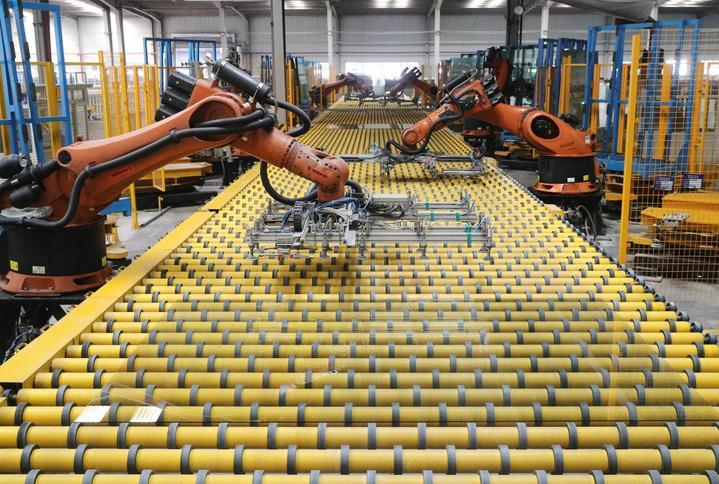 秦皇島海港經(jīng)濟(jì)開發(fā)區(qū)一家玻璃企業(yè)的機(jī)器手在工作中(2023年2月17日攝)。新華社記者 楊世堯攝