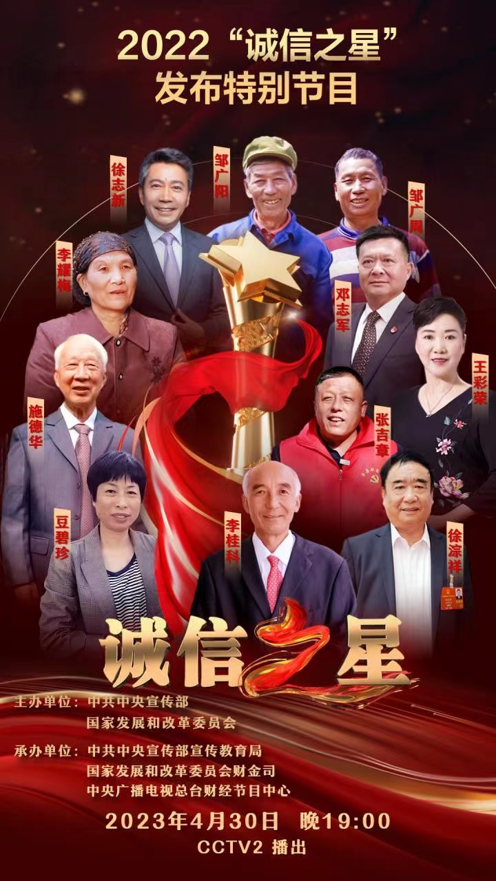 “誠信之星”發(fā)布特別節(jié)目將由中央廣播電視總臺(tái)財(cái)經(jīng)頻道于4月30日19時(shí)首播,相關(guān)融媒體作品《致敬“誠信之星”》、主題曲《誠信之光》也將同步推送。