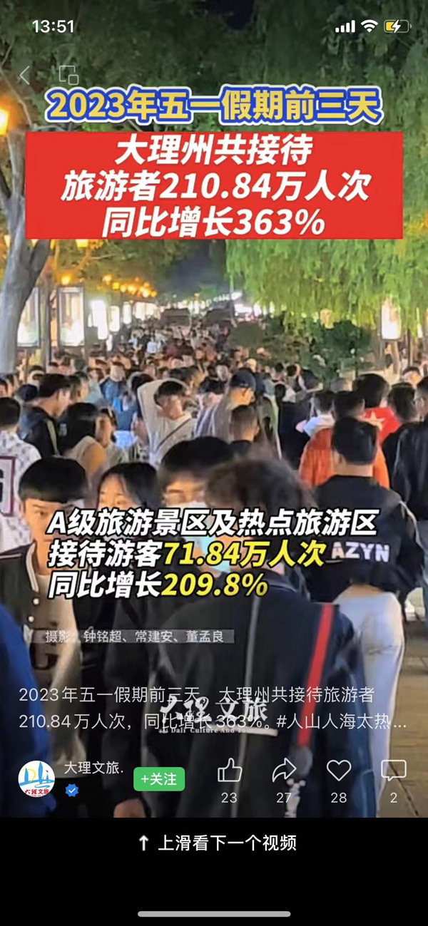 大理旅游“人氣”直線飆升,強勁勢頭不減。4月29日“五一”假期首日,央視新聞就曾報道,“五一”假期旅游市場熱度高漲,從搜索大數(shù)據看,大理、大理古城成為“五一”假期熱門旅游目的地和熱門景區(qū)之一。