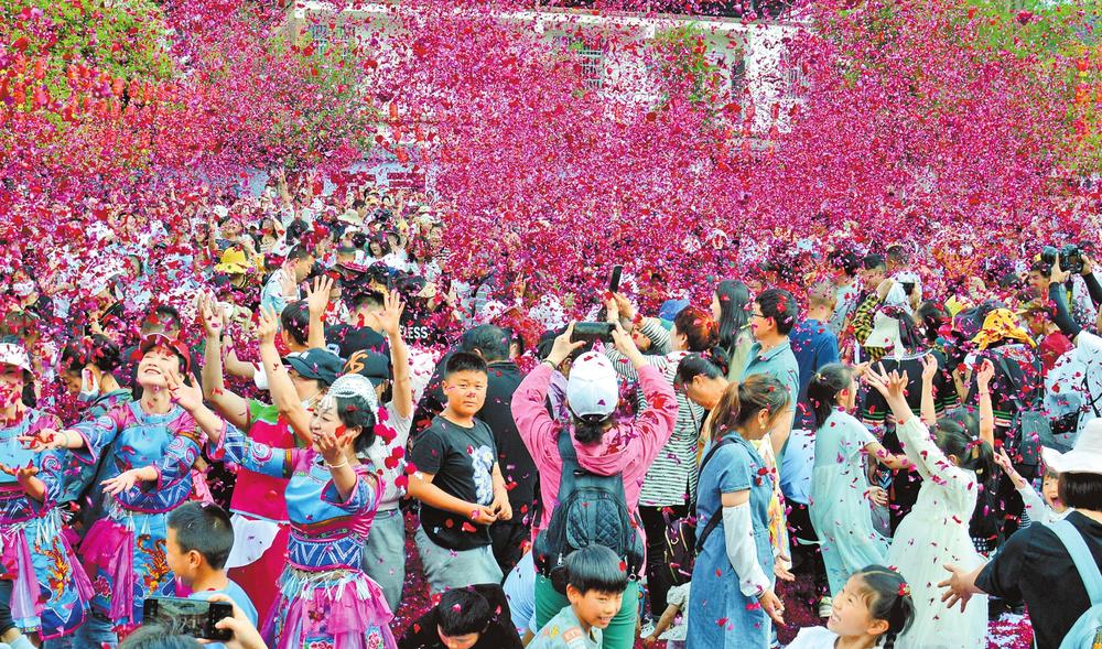 游客參與昆明晉寧區(qū)昆陽街道下方古城村“三月十三”民間民俗米線節(jié)的“仙女散花”活動。本報記者楊崢 通訊員楊崇云/攝