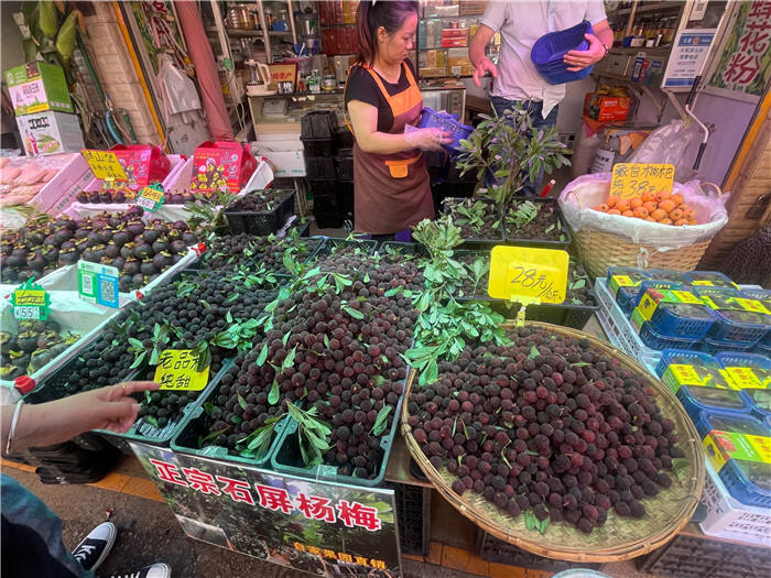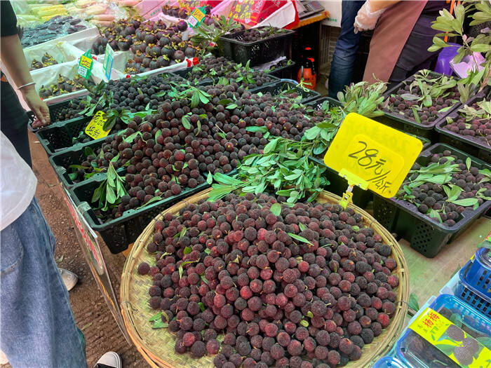 在篆新農(nóng)貿(mào)市場內(nèi),除了鮮紅的荔枝,一筐筐紫中帶黑、大小不一的楊梅也吸引了很多的市民駐足購買。市場內(nèi)的楊梅大多來自云南石屏,4月初,那時的楊梅60-70元/公斤,不僅量少個小且口感偏酸,銷量并不高。但這些天,隨著楊梅供應(yīng)量快速增長,楊梅價格應(yīng)聲而落,不僅每公斤只需20元-55元,口感也更加的甜,也更受消費(fèi)者的喜歡,銷量較4月份也增長不少。