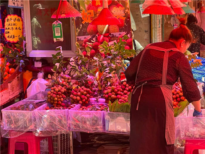 5月4日,節(jié)后的大觀篆新農(nóng)貿(mào)市場依舊煙火氣十足,市場內(nèi)的市民摩肩接踵,進(jìn)口處水果攤上的新鮮荔枝格外誘人,攤前的大姐熱情地向市民們發(fā)出品嘗邀請,不一會品嘗的人就包圍了水果攤,但停下來購買的人卻很少。