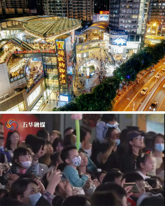 4月29日晚,五華區(qū)商投局聯(lián)合公安等區(qū)級(jí)各部門在南屏廣場(chǎng)開展了精彩絕倫的無人機(jī)展演活動(dòng),立體絢爛、科技感滿滿的無人機(jī)勾勒出“我愛五華”“五華煥新消費(fèi)季”、宇航員、潮兔等壯觀的畫面,8點(diǎn)30分無人機(jī)升空表演的瞬間,市民們歡呼雀躍、熱鬧非凡,活動(dòng)現(xiàn)場(chǎng)人山人海、人頭攢動(dòng)。南屏廣場(chǎng)人流量達(dá)30萬,堪比春節(jié)期間的南屏客流。南屏周邊的順城、百盛、昆百大等商場(chǎng)同樣摩肩接踵,客流量達(dá)20萬。