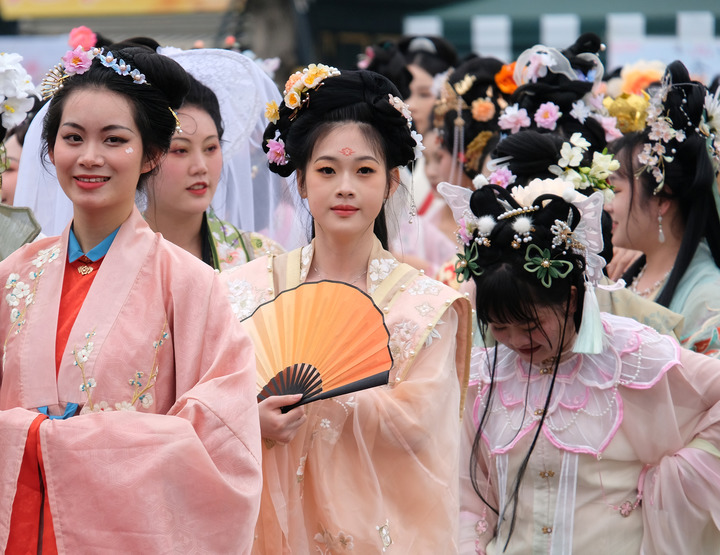 3月18日,身著古風(fēng)服飾的人們在廣西南寧園博園參加花朝盛典活動。新華社記者 周華 攝