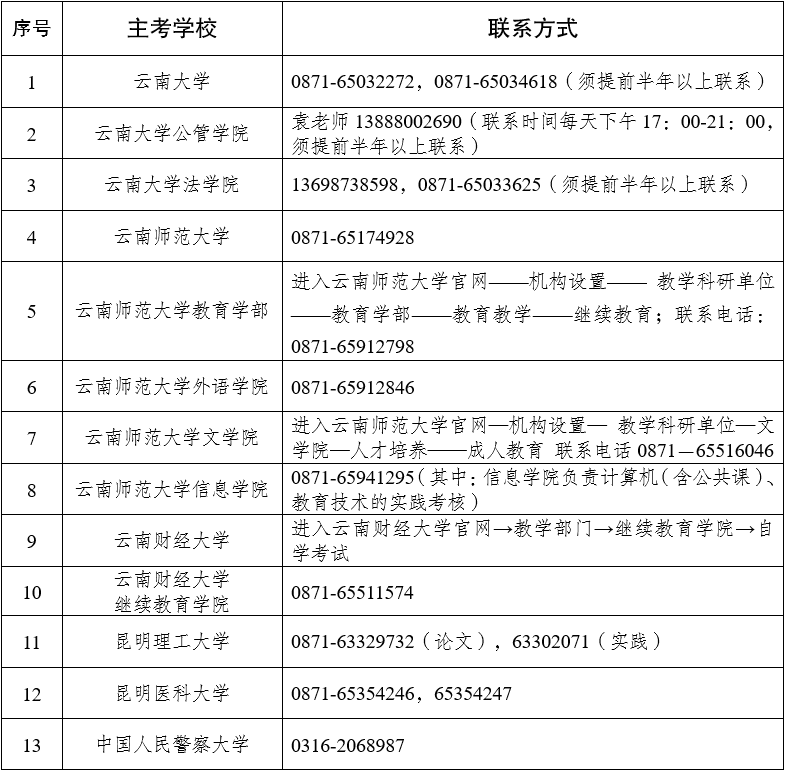 十、云南省高等教育自學(xué)考試各專業(yè)實(shí)踐性環(huán)節(jié)考核、學(xué)習(xí)、論文答辯聯(lián)系方式: