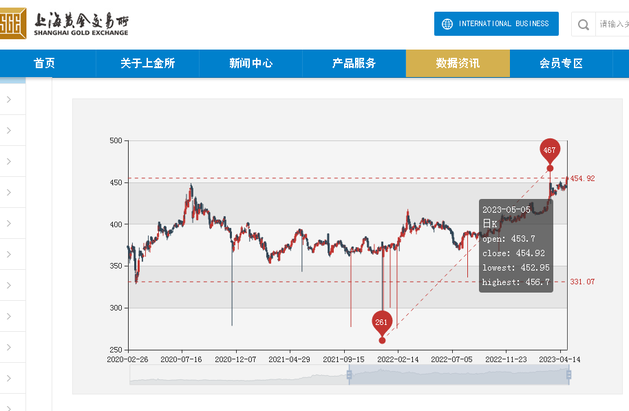 2020年8月7日,黃金Au99.99期貨收盤價(jià)達(dá)446元/克,創(chuàng)歷史新高,之后一直在350元/克至410元/克之間運(yùn)行。2023年3月黃金價(jià)格持續(xù)上漲,上海黃金交易所交易數(shù)據(jù)顯示,5月8日Au99.99黃金收盤價(jià)已達(dá)453元/克,刷新歷史記錄。