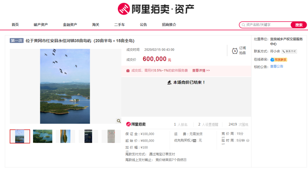 僅隔五天,又有位于黃岡麻城市的267畝島嶼拍賣(mài),以125萬(wàn)成交。