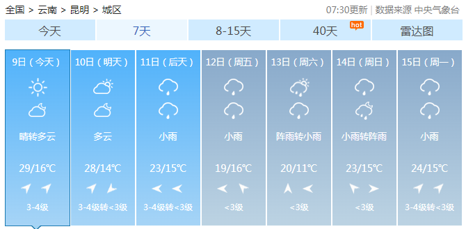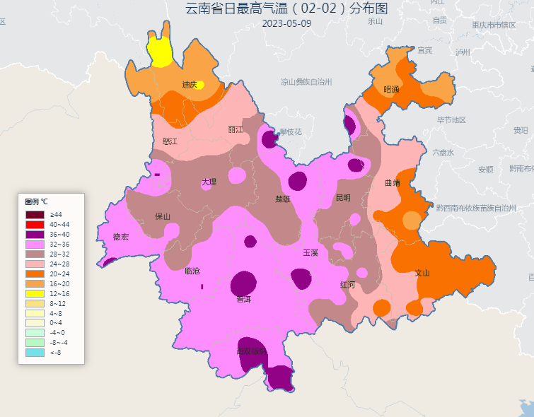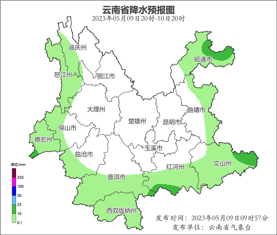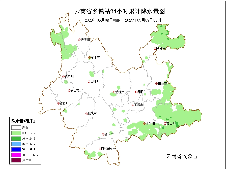 05月09日20時到05月10日20時:昭通、曲靖東部、文山、紅河南部、普洱南部、西雙版納、臨滄西部、德宏、保山西部、怒江、迪慶西部多云有陣雨局部中雨,其它地區(qū)晴間多云。