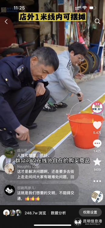 4月4日,晉寧區(qū)融媒體中心在抖音、快手、視頻號(hào)3個(gè)平臺(tái)上發(fā)布了一條24秒長(zhǎng)的短視頻,內(nèi)容是晉寧城管在東門路商鋪施劃“1米線”,黃線內(nèi),商家可以沿線展示商品;黃線以外,群眾可以“自在”選購(gòu)商品?!?米線”同時(shí)滿足了商家的經(jīng)營(yíng)和群眾的買賣需求,避免反復(fù)占道經(jīng)營(yíng)行為堵塞人行道,有效改善和提升了市場(chǎng)周邊的市容環(huán)境衛(wèi)生秩序,也改善了城管與商戶之間的關(guān)系。商戶們表示,“1米線非常人性化,大家會(huì)自覺(jué)規(guī)范經(jīng)營(yíng)行為”。