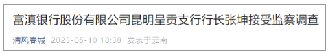 據(jù)昆明市紀(jì)委監(jiān)委消息:富滇銀行股份有限公司昆明呈貢支行行長張坤涉嫌嚴(yán)重違法,經(jīng)昆明市監(jiān)委指定西山區(qū)監(jiān)委管轄,目前正在接受監(jiān)察調(diào)查。
