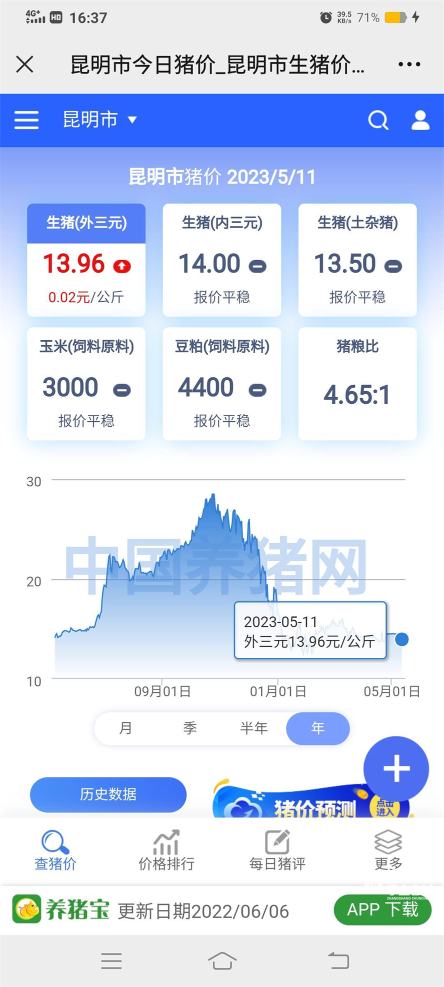生豬價格是否還會跌價?5月11日,全國、云南、昆明豬糧比分別為4.97:1、4.2:1、4.65:1,預(yù)計生豬價格和豬肉價格下行空間都不大。(昆明日報 記者楊官榮)