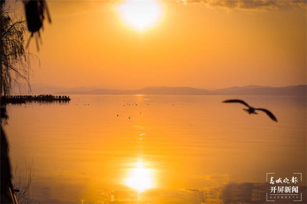 “滇池+日落”的美,除了海晏村,在斗南濕地公園、王官濕地公園、撈漁河濕地公園和呈貢區(qū)江尾村等地也可感受到?!拔以团笥讶ザ纺蠞竦毓珗@看過日落,因為離得近,好多人還從斗南花市買了鮮花帶去拍照?!卞X磊說。
