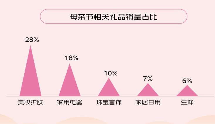 在品類選擇上,男性愛給母親買家電,銷量占比35%;女性愛送母親化妝品,銷量占比39%。