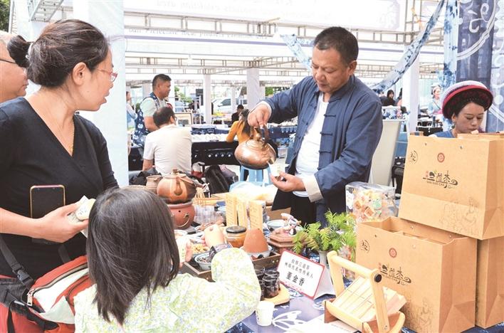 南國城(密灣)分會場非遺特色集市里游客正在品嘗白族三道茶。