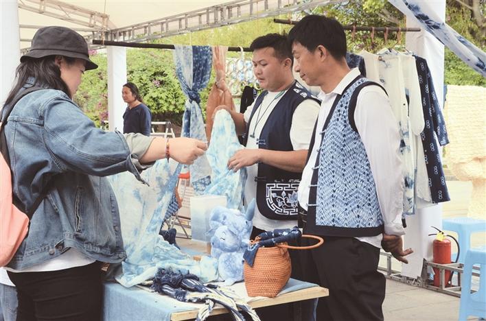 南國城(密灣)分會場非遺特色集市里攤主正在給游客介紹扎染。