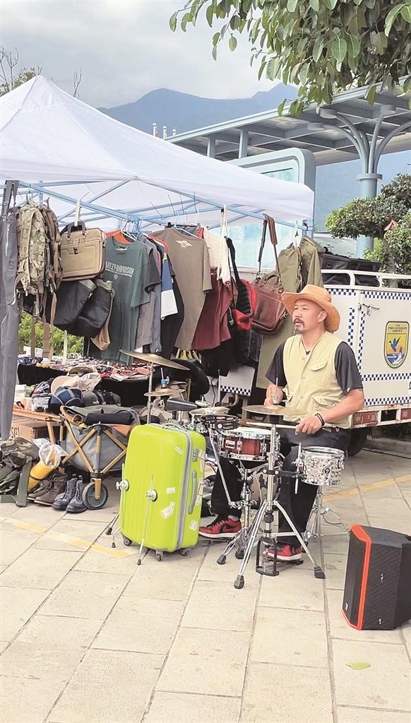 ▲ 南國城(密灣)分會場文創(chuàng)集市的攤主在擺攤時打起了架子鼓。