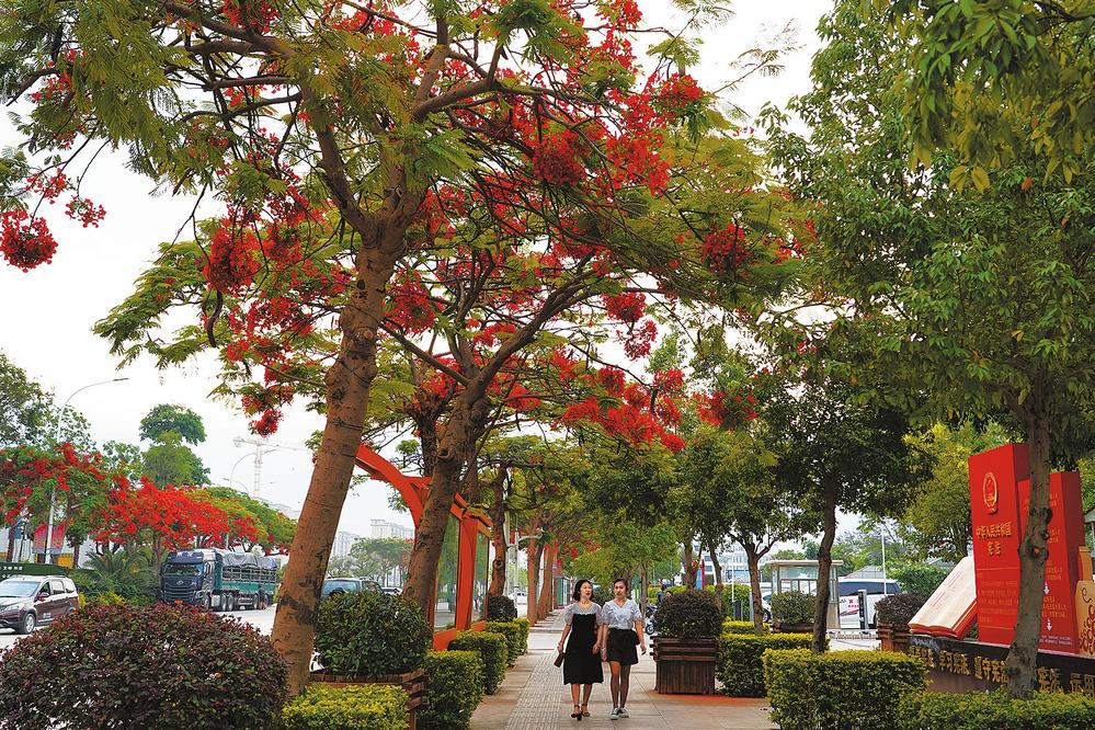 “葉如飛凰之羽,花若丹鳳之冠”是對鳳凰樹的貼切描寫。正如其名,鳳凰樹葉片狀似鳳凰尾羽,花開恍若滿樹焰火。進(jìn)入5月,那滿樹的“火”、滿地的紅,散落在城區(qū)公園、道路、街角,一團(tuán)團(tuán)、一簇簇,鮮艷奪目,鋪陳出一道道亮麗的風(fēng)景線。