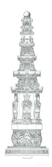 2012至2013年,昆明市博物館邀請(qǐng)成都市文物考古研究院盧引科先生對(duì)經(jīng)幢進(jìn)行了考古測量和繪圖,共繪制考古線圖90幅。此次繪制的考古線圖,全面展示了經(jīng)幢的內(nèi)部榫卯結(jié)構(gòu)和主題雕刻風(fēng)格,也更清晰地呈現(xiàn)了眾多造像的細(xì)節(jié),從而便利于對(duì)經(jīng)幢的進(jìn)一步精深研究。在此次展覽上,完整版本的經(jīng)幢線圖將首次公開展出。