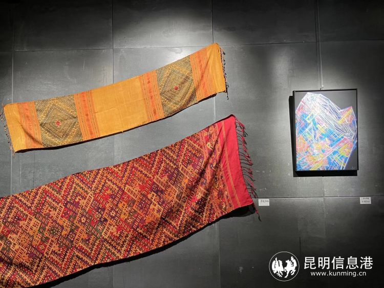 “串聯(lián)”作為本次展覽的一大特色,除了體現(xiàn)了展品類別的上,還體現(xiàn)在視覺的呈現(xiàn)上。展廳中,老撾的織物旁是現(xiàn)代畫家馬力與金大偉的繪畫創(chuàng)作。傳統(tǒng)織物紋樣包含了民族的奧秘和對(duì)美的向往,畫家馬力的作品用細(xì)膩的線條呈現(xiàn)了織物的微觀世界,層層疊加卻又根根分明,金大偉的繪畫創(chuàng)作則通過大的色塊展現(xiàn)了織物的宏觀世界,肌理與紋樣清晰可見。三種作品的串聯(lián),讓這樣的對(duì)話擁有了跨越地域媒介的韻味。