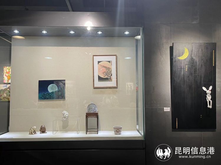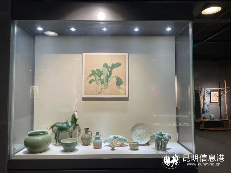像這樣的對(duì)話在展廳里隨處可見,日本江戶時(shí)代浮世繪畫家葛飾北齋的花鳥浮世繪與中國(guó)科學(xué)博物畫第一人曾孝濂的植物博物畫的對(duì)話,現(xiàn)代畫家荀貴品創(chuàng)作的《山茶花系列》與同樣色彩艷麗,畫著花草紋樣的尼泊爾寶石鑲嵌銅象、安南紅綠彩盤間的對(duì)話,讓繁花長(zhǎng)盛的昆明,增添了幾份不可言說的想象。19世紀(jì)不知名作者畫下的一幅綠色苦菜,與同樣綠色的華寧窯、緬甸綠釉陶、還有歷史深處走來(lái)綠色的瓷馬間的對(duì)話,讓青與綠成了文明互鑒間的底色。還有現(xiàn)代畫家蘇斌《月出》,與古代的陶瓷兔子、銅鏡上搗藥的玉兔、浮世繪中的玉兔,以及現(xiàn)代藝術(shù)家張聶聶的編織兔子間的對(duì)話,傳遞著千百年來(lái)人們對(duì)月亮與兔子的美好想象。