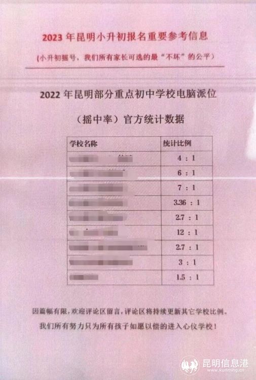 昆明信息港訊 記者合宇聰 記者從昆明市公安局獲悉,4月30日,網(wǎng)民(抖音賬號(hào)“谷耕課堂”)在抖音、今日頭條短視頻平臺(tái)發(fā)布“最新官方統(tǒng)計(jì)昆明主城區(qū)民轉(zhuǎn)公后各重點(diǎn)初中小升初電腦派位(搖號(hào)率)參考”并配圖稱“2022年昆明部分重點(diǎn)初中學(xué)校電腦派位(搖中率)官方統(tǒng)計(jì)數(shù)據(jù)”。消息發(fā)布后引起部分家長擔(dān)心憂慮,紛紛到學(xué)校咨詢,嚴(yán)重?cái)_亂招生秩序。