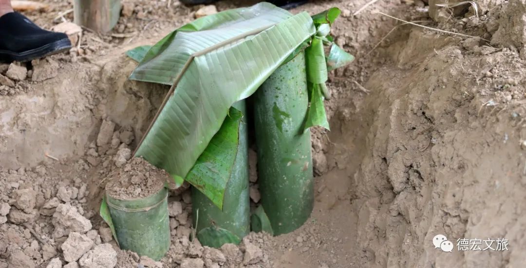 茶葉填滿(mǎn)后,用新鮮芭蕉葉封口,選一處陰涼的地方挖一個(gè)深坑,墊上芭蕉葉,再將封好的竹筒埋起來(lái),讓茶葉在地下以純天然的方式慢慢發(fā)酵。根據(jù)光照雨水的變化,大概需要30至50天。