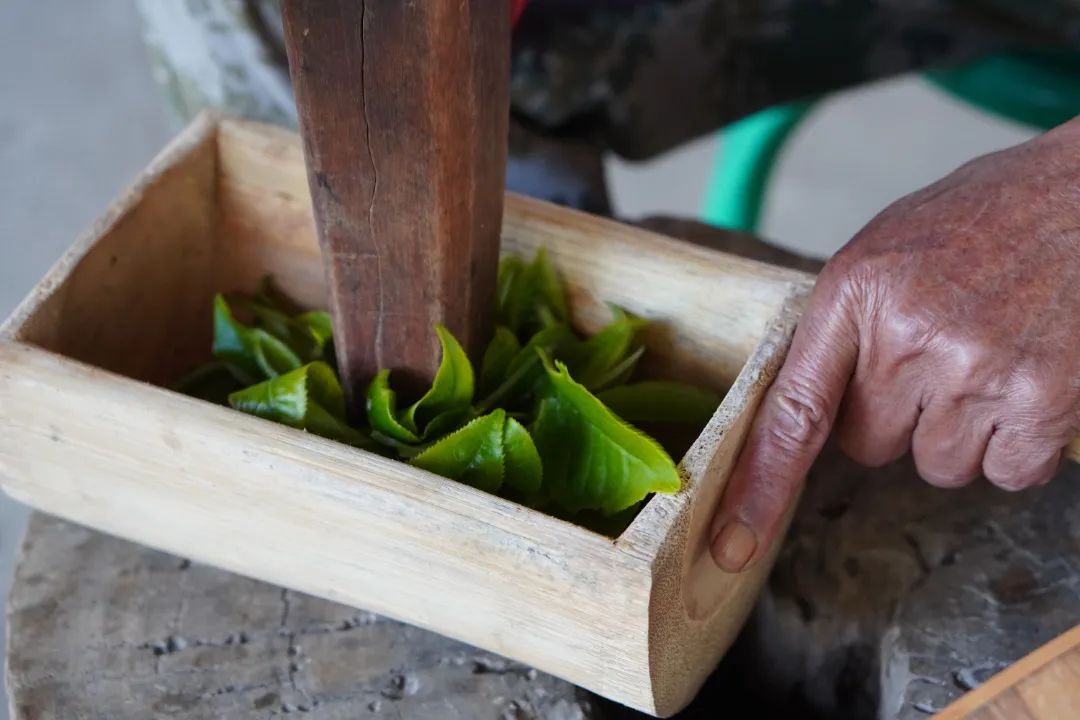 竹筒開(kāi)封后,把茶葉取出,經(jīng)過(guò)精心挑選,上好的酸茶會(huì)呈金黃色,發(fā)酵后的茶葉放在石臼中,用傳統(tǒng)的腳碓舂爛,揉成小團(tuán),壓成餅狀,曬2天左右,剪成小塊,接著再暴曬5天就能得到成品。