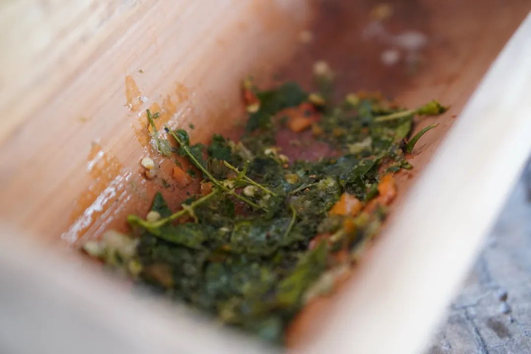 制作“涼拌茶”,只需將嫩茶葉、大蒜、野八角、辣椒、鹽、檸檬葉、香葉等佐料與香料舂碎后,再放入茶葉舂碎,最后加入水,一道獨(dú)具特色的基諾族“涼拌茶”便制作完成。茶湯鮮香,稍稍湊近,茶香便撲鼻而來(lái)。
