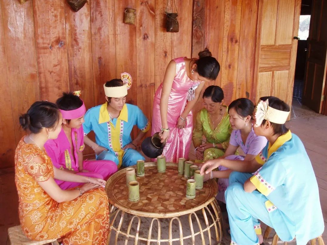 傣族喜歡飲用“竹筒茶”,“竹筒茶”在傣語(yǔ)里稱(chēng)為“臘跺”,是一種充滿(mǎn)詩(shī)情畫(huà)意的飲茶方式。將曬干的春茶放入剛砍回的香竹筒,放在火塘的三腳架上烘烤6—7分鐘后竹筒內(nèi)茶葉軟化,用木樟將竹筒內(nèi)茶葉舂壓后再裝進(jìn)茶葉,隨后邊裝、邊烤、邊舂,直至竹筒內(nèi)茶葉填滿(mǎn)舂緊為止。