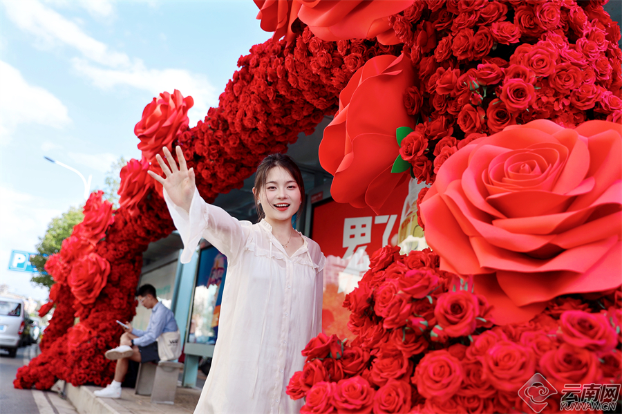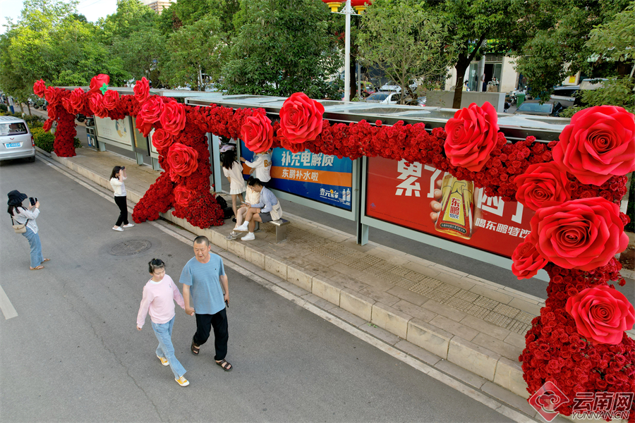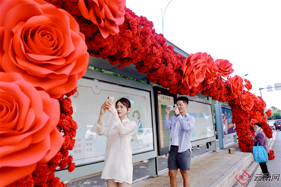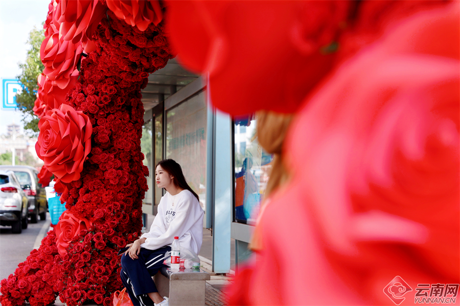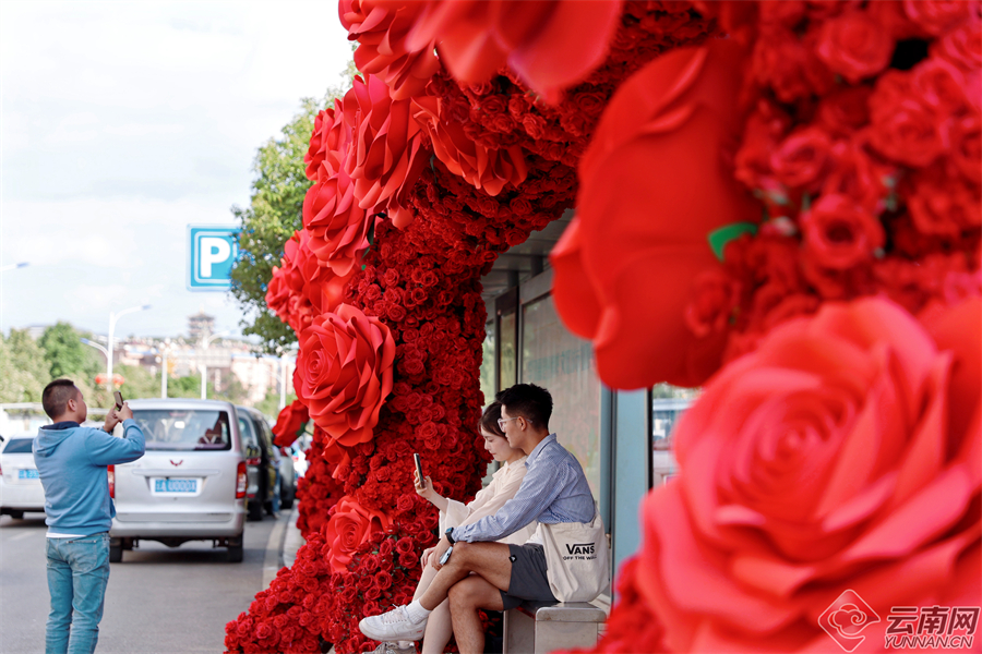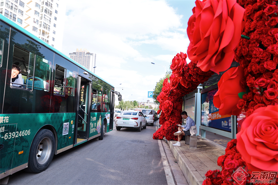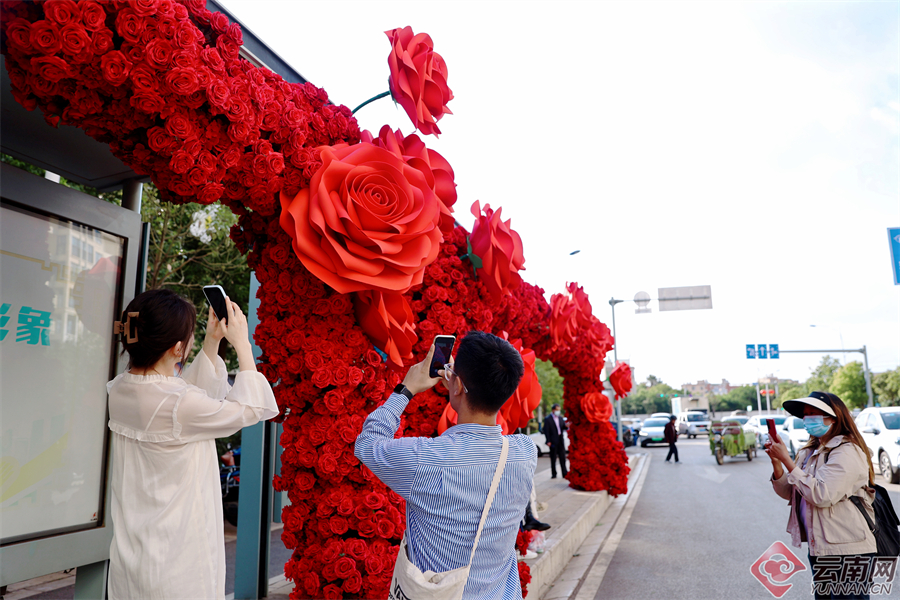 連日來,斗南花市周邊的多個(gè)鮮花站臺(tái)成功出圈,成為春城市民和游客爭(zhēng)相打卡的夏季浪漫景點(diǎn)。近日,呈貢又一座公交站臺(tái)“開”滿了火紅而炙熱的玫瑰,走進(jìn)鋪滿巨型玫瑰的“斗南花市東”站,昆明專有的浪漫和熱情撲面而來。