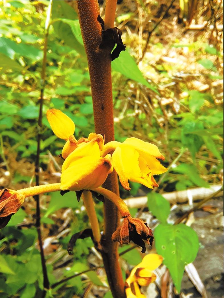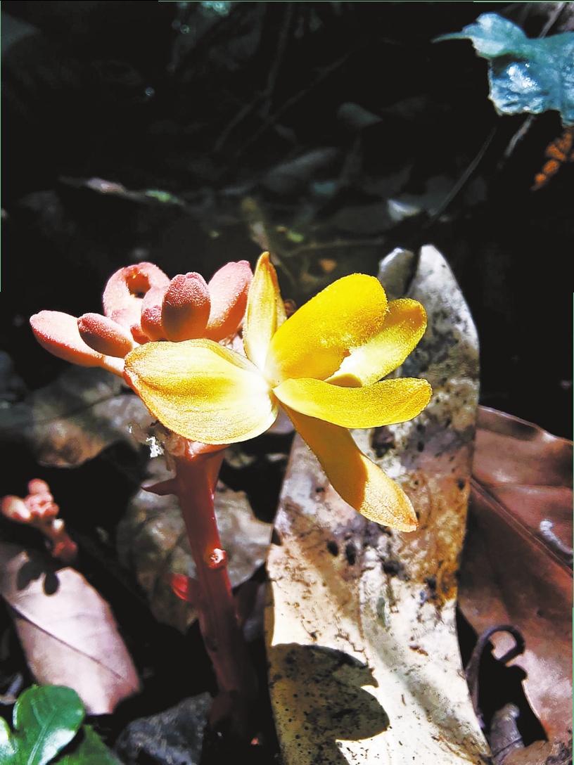 同屬于腐生植物的毛萼山珊瑚又叫金花無葉蘭,莖直立,紅褐色,在地表上部分無葉,只有植物莖和花朵,高約1至2米,花呈黃色,花朵開放后直徑達(dá)3.5厘米,而果實(shí)呈橢圓形,似莢果。因?yàn)樗纳L條件極為苛刻,常常被稱為山中珍品。它在藥用功效上似天麻,但又勝過天麻,是最高大的蘭科植物,十分珍貴,有極高的藥用價值和觀賞價值,且非常難以培育,常生于林下或溝谷邊蔭蔽處。(記者羅宗偉 通訊員王如陽 焦立鳩 攝影報道)