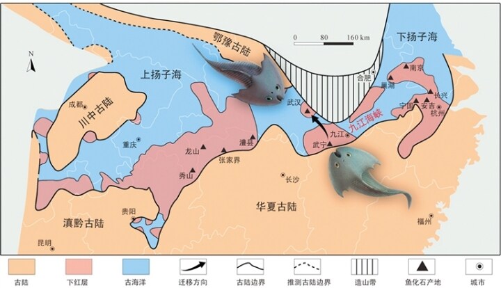 系統(tǒng)古生物學(xué)研究在一定程度上也是已滅絕生物的“尋親之旅”,當(dāng)找到同一個(gè)屬的幾個(gè)不同物種的時(shí)候,堪稱找到了該物種的兄弟姐妹,表明兩個(gè)物種形成地理隔離不久,剛剛分化成兩個(gè)新物種。本次在江西武寧發(fā)現(xiàn)的九江江夏魚是江夏魚屬的第二個(gè)物種,該屬的第一個(gè)物種發(fā)現(xiàn)于湖北武漢,叫做后棘江夏魚。古地理研究表明4.38億年前的志留紀(jì)早期,以我國(guó)長(zhǎng)江流域?yàn)橹鞯娜A南板塊曾是一片廣闊的海洋,被稱為揚(yáng)子海。該海域又被進(jìn)一步分為上、下?lián)P子海,兩者之間存在一狹長(zhǎng)的淺海海域——九江海峽。九江海峽橫貫東西,北臨鄂豫古陸,南接華夏古陸。湖北武漢和江西武寧分別位于鄂豫古陸南側(cè)和華夏古陸北側(cè),兩地隔九江海峽跨海相望,最近處直線距離相距不足200公里。江西武寧志留紀(jì)早期的盔甲魚物種多樣性最高,幾乎涵蓋了其他地區(qū)的所有屬種,說(shuō)明江西武寧地區(qū)可能是盔甲魚類輻射和擴(kuò)散的中心之一。江夏魚屬在兩地的同時(shí)發(fā)現(xiàn)表明,在志留紀(jì)早期盔甲魚類可能通過(guò)上、下?lián)P子海之間的九江海峽完成了跨揚(yáng)子海的南北遷徙,從而使盔甲魚類能夠沿著揚(yáng)子海北緣向東、西分別擴(kuò)散至安徽巢湖和湖北京山。