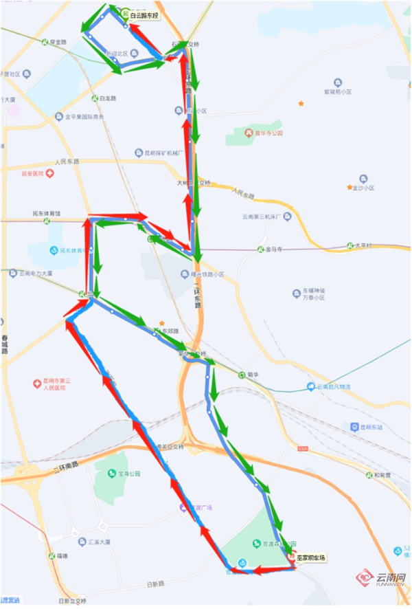 254路起終站為“巫家壩車場(chǎng)(雨龍路)(始發(fā)站)——白云路東段(終到站)”。調(diào)整后,254路起終站不變,去程按原線行駛至雨龍路,經(jīng)雨龍路、日新路、民航路、環(huán)城南路、環(huán)城東路回原線行駛;回程不變。新增??俊肮俣蓞^(qū)醫(yī)院(去)、關(guān)上(日新路)(去)、關(guān)上(民航路)(去)、官渡廣場(chǎng)(民航路)(去)、關(guān)興路口(民航路)(去)、五里多村(去)、吳井路口(民航路)(去)、民航路(去)”等8個(gè)公交站;同時(shí)取消停靠“關(guān)通路口(雨龍路)(去)、雨龍路(去)、彩云北路口(雨龍路)(去)、菊花村(云中二院)(去)”等4個(gè)公交站。線路營運(yùn)時(shí)間及票制票價(jià)不變。(云南網(wǎng) 記者段芃)