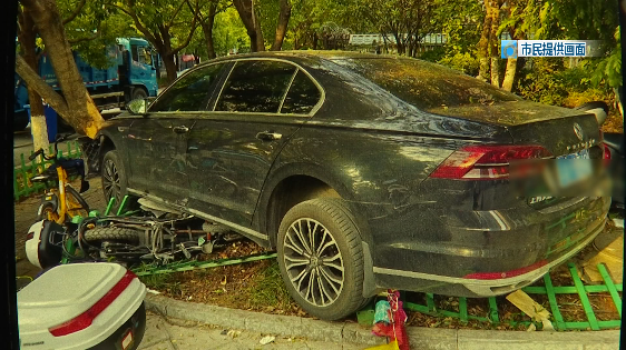 從市民提供的畫面可以看到,一輛黑色的大眾轎車沖進(jìn)了綠化帶中,車頭下方有被撞斷的樹(shù)枝和受損的護(hù)欄,而車頭一側(cè)剛好抵在人行橫道旁的行道樹(shù)上,還有幾輛電動(dòng)車壓在車身下。