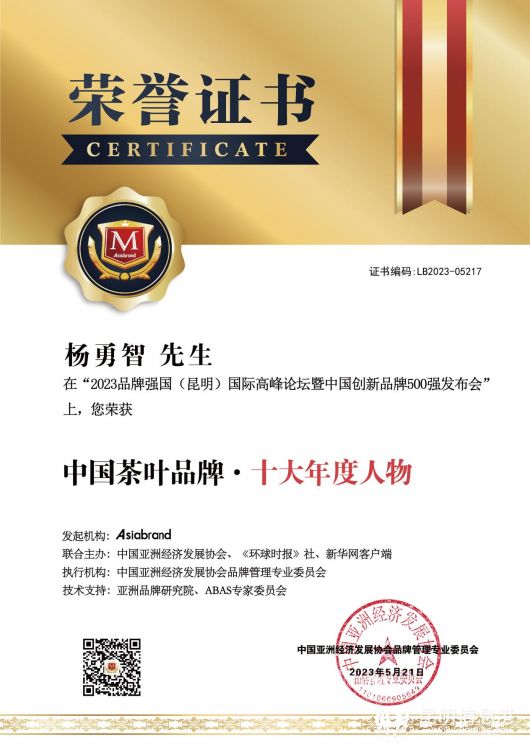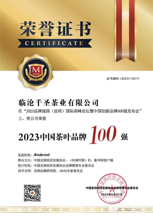 臨滄千圣茶業(yè)有限公司董事長(zhǎng)楊勇智為新時(shí)代非遺茶文化傳播大使、國(guó)家級(jí)非遺(制茶)技藝傳承師、國(guó)家級(jí)非遺茶文化傳承師。作為公司品牌的創(chuàng)始人,受邀參加大會(huì),并斬獲雙獎(jiǎng)。他表示:臨滄市有著稀缺珍貴、豐富的古茶樹(shù)資源,公司堅(jiān)信依托家鄉(xiāng)得天獨(dú)厚的茶樹(shù)資源,更有信心做好千圣茶業(yè)品牌,持續(xù)提升臨滄千圣茶業(yè)“品牌力”。在品牌經(jīng)濟(jì)時(shí)代,做好茶葉品牌價(jià)值成長(zhǎng)的榜樣。