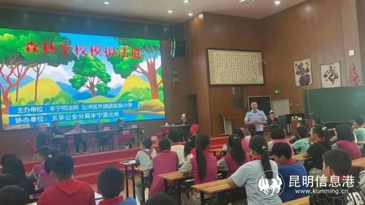昆明信息港訊 記者合宇聰 日前,昆明市公安局五華分局豐寧派出所聯(lián)合豐寧司法所在轄區(qū)外國語實驗小學(xué)開展“普法強基補短板專項行動”之模擬法庭進校園活動。