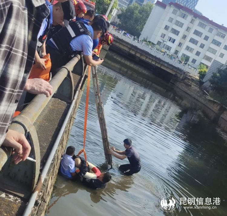 昆明信息港訊 記者合宇聰 5月24日上午,一名老人在日新路地鐵站D口附近失足跌入一旁的清水河中,情況十分危急。昆明市公安局特警支隊七大隊65號車接報后迅速趕往現(xiàn)場,民警梁靖宇沒有絲毫猶豫,縱身躍入垂直高度近5米的水中對跳水老人展開救援。
