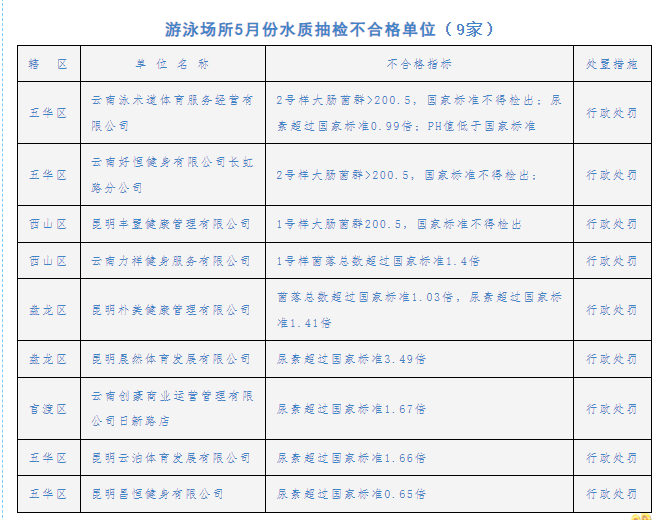 游泳池水水質檢測項目為細菌總數(shù)、大腸菌群、尿素、游離性余氯、渾濁度、PH值等6項指標。針對抽檢不合格9家游泳場所,昆明市衛(wèi)生健康委綜合監(jiān)督執(zhí)法局依據(jù)《公共場所衛(wèi)生管理條例實施細則》規(guī)定,對9家游泳場所進行行政處罰,并責令立即改正。