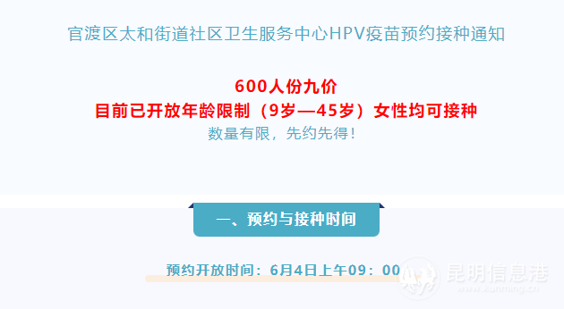 昆明信息港訊 記者鄧國(guó)梅 6月1日,記者從官渡區(qū)太和街道社區(qū)衛(wèi)生服務(wù)中心獲悉,6月4日9時(shí),600人份九價(jià)HPV疫苗將在滇醫(yī)通平臺(tái)放號(hào),9歲—45歲女性均可接種。