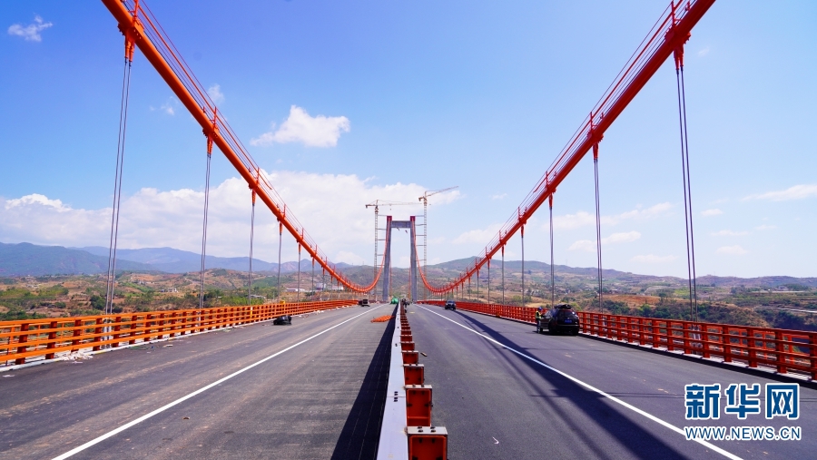 永仁大橋位于云南省楚雄彝族自治州永仁縣和大姚縣交界的山嶺地帶,橫跨江底河峽谷,大橋全長1668米,采用雙塔單跨鋼箱加勁梁懸索橋設(shè)計,是永大高速重要控制性工程。永仁岸主塔高度為192.7米,大姚岸主塔高度為107.7米,橋面距江底河峽谷谷底高達(dá)350米,是楚雄州境內(nèi)最大的一座在建公路懸索橋、云南省在建第三大懸索橋。目前,永仁大橋建設(shè)進入收尾階段。(新華網(wǎng) 蘇波)