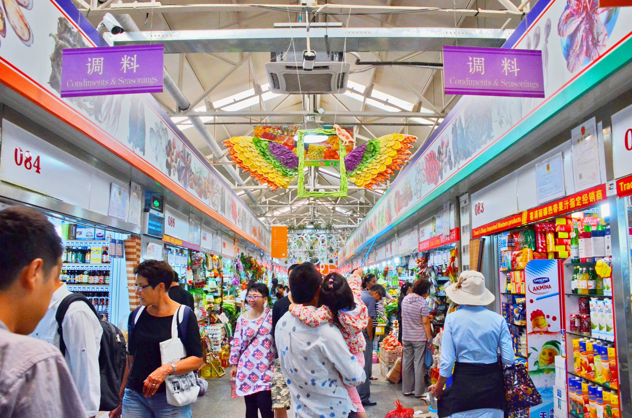 與一般菜市場的格局不同,北京赫赫有名的三源里菜市場更像是一條傳統(tǒng)的商業(yè)街。市場里面的商品種類齊全,天南地北、海內(nèi)海外,只要跟吃沾邊的這里應(yīng)有盡有。這里不但干凈整潔,而且充滿藝術(shù)氣息,不時還會有一些新書發(fā)布會、書畫展之類的文化活動。