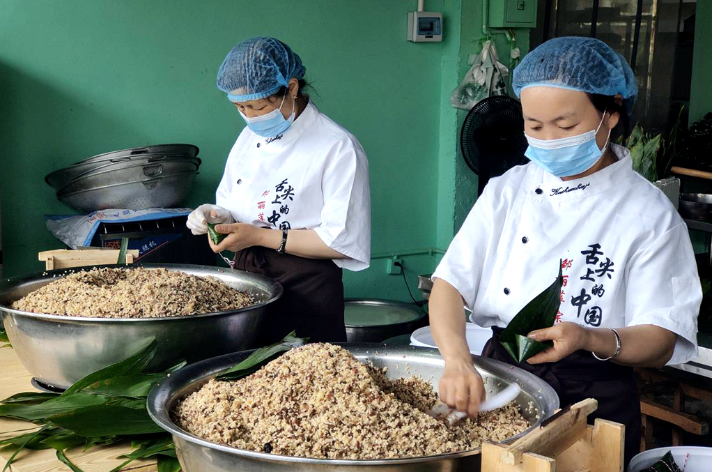 鄒麗萍的店里有20多名工人,大家都是本地人,包粽子是這些婦女都會(huì)的一項(xiàng)技能,如今在鄒麗萍的店里,她們就著這項(xiàng)手藝?yán)瞄e暇時(shí)間就能增收。