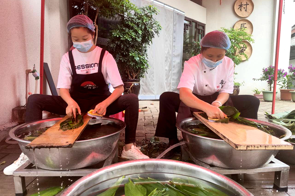 工人正在清洗粽葉。6月5日攝