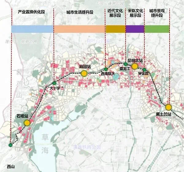 根據(jù)規(guī)劃,昆明米軌城市段根據(jù)沿線城市功能、資源情況的不同,分為5段設(shè)計,分別為:米軌文化展示段、近代文化展示段、城市生活提升段、產(chǎn)業(yè)置換優(yōu)化段、城市景觀提升段。