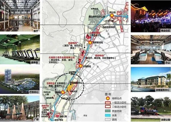 產(chǎn)業(yè)置換優(yōu)化段,沿線用地多為工業(yè)用地,結(jié)合可更新用地及兩處工業(yè)遺產(chǎn)改造,提升城市功能。值得關(guān)注的是,該段線路的石咀站為西客站站房所在地,按照此前規(guī)劃,新建的西客站將預(yù)留米軌站臺,此次規(guī)劃顯示,石咀站附近規(guī)劃了游客服務(wù)中心、主題公園、主題酒店、商業(yè)等。昆明電機廠附近規(guī)劃了演藝廣場、創(chuàng)意辦公、商業(yè)等。昆明電纜廠周邊規(guī)劃有展覽廳、展覽館、社區(qū)鄰里中心等。