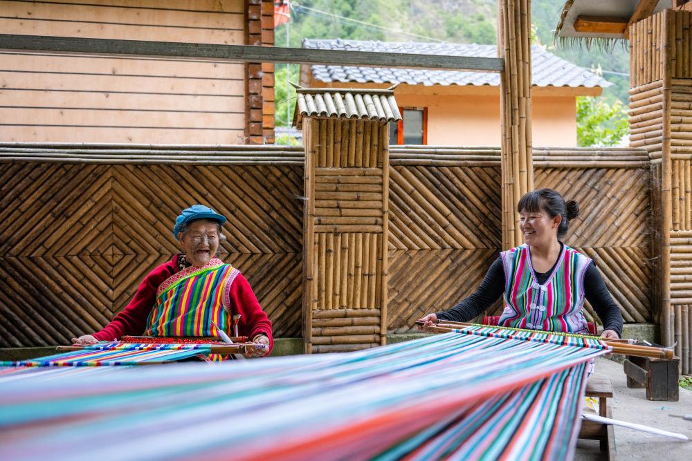 獨(dú)龍族老人李文仕(左)和女兒在編織獨(dú)龍?zhí)?曹夢(mèng)瑤 攝