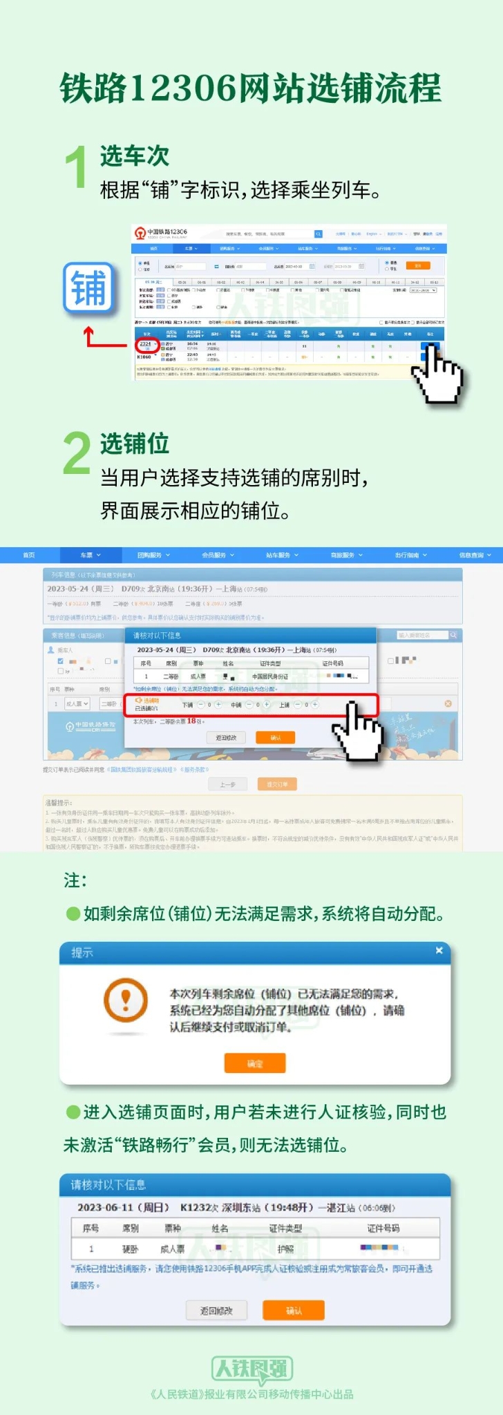 在線選鋪服務推出后,旅客在12306網站購買試點車次臥鋪車票,可在線自主選擇試點普速列車硬臥的上、中、下鋪和軟臥的上、下鋪,動車組軟臥的上、下鋪,一等臥的上、下鋪,二等臥的上、中、下鋪等鋪別,系統(tǒng)將自動為旅客分配符合要求的鋪位,同時繼續(xù)實行對60歲以上老人等重點旅客優(yōu)先分配下鋪的服務。如剩余鋪位無法滿足選鋪需求,系統(tǒng)將隨機分配鋪位,旅客可根據自身情況選擇接受或者取消。旅客線下購票仍可自主選擇鋪別。