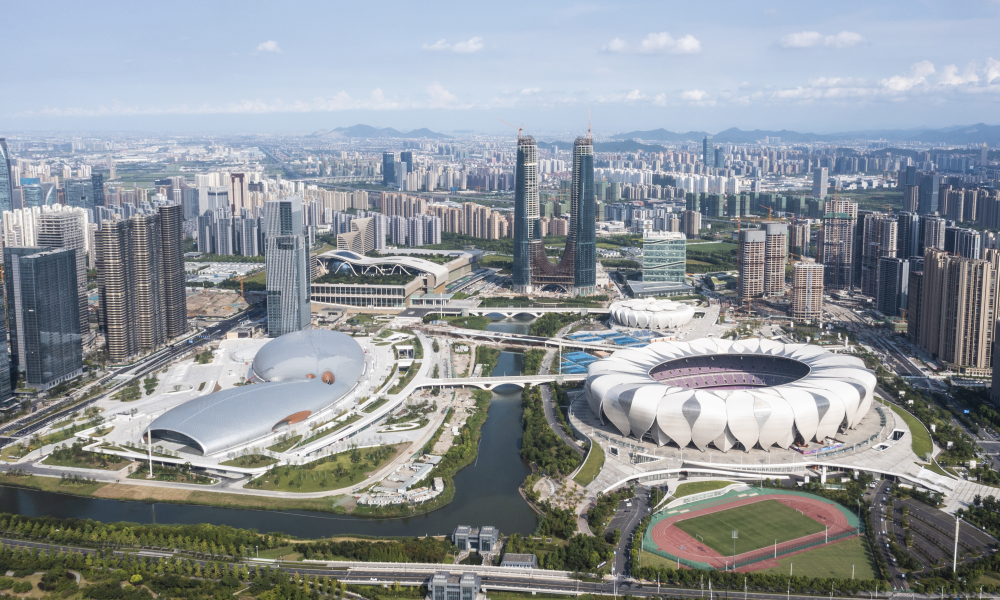 2021年8月2日拍攝的杭州奧體中心場館群(無人機照片)。新華社發(fā)(杭州亞組委供圖)