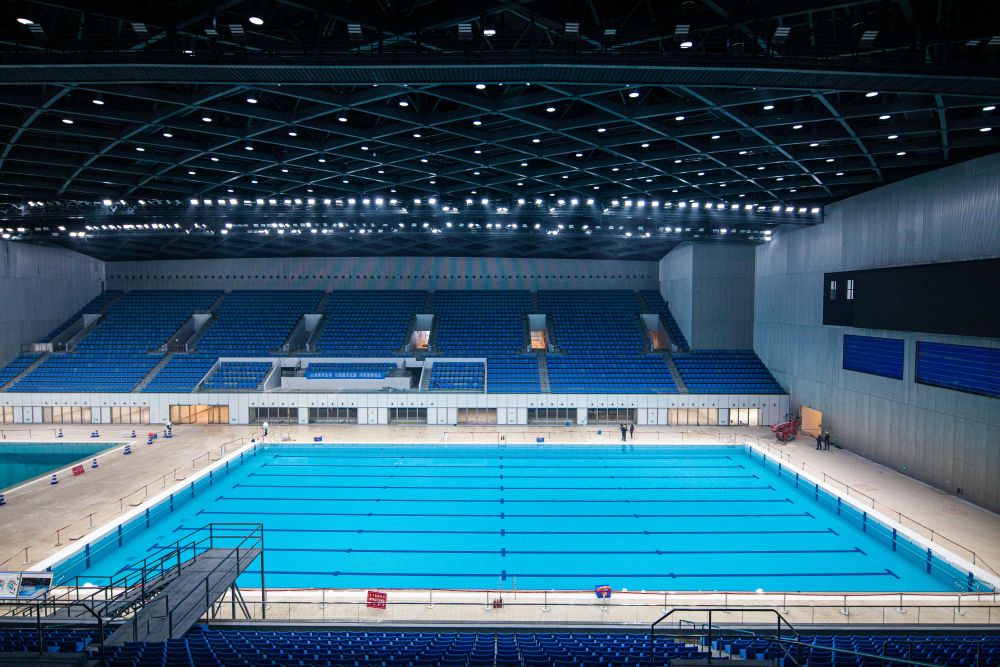 杭州奧體中心游泳館可容納觀眾6000人,設(shè)有比賽池、跳水池、熱身池等五個水池,將舉辦杭州亞運會游泳、跳水和花樣游泳三項比賽,決出53枚金牌,是杭州亞運會產(chǎn)生金牌最多的場館。